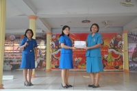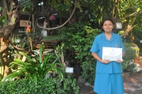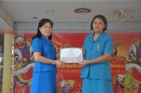 นางหทัยรัตน์ เขียวเอี่ยม ผู้อำนวยการโรงเรียนวัดลาดปลาเค้า มอบเกียรติบัตรครูผู้รักษ์สิ่งแวดล้อม แก่ครูเกื้อกูล รูปสูง ครูผู้เสียสละดูแลสิ่งแวดล้อมภายในโรงเรียน