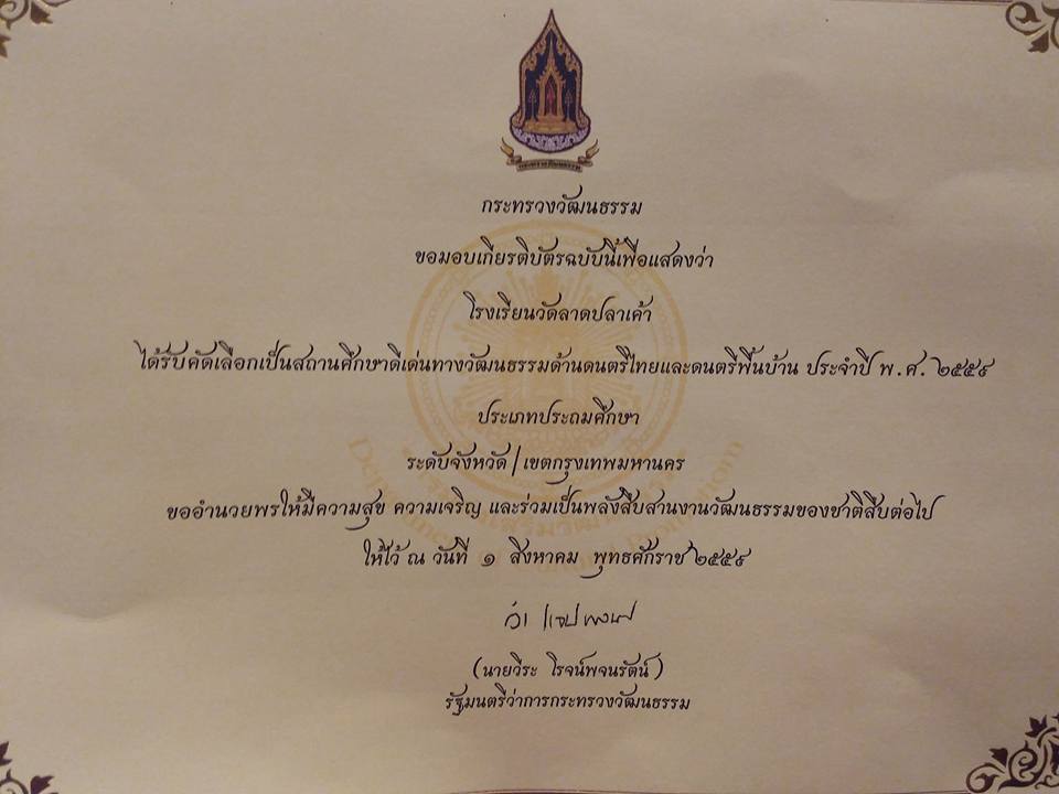 โรงเรียนวัดลาดปลาเค้า รับรางวัลสถานศึกษาดีเด่นทางวัฒนธรรมด้านดนตรีไทยและดนตรีพื้นบ้าน ประจำปี พ.ศ.2559 เมื่อวันที่ 1 สิงหาคม 2559 ณ ศูนย์วัฒนธรรมแห่งประเทศไทย จัดโดยกรมส่งเสริมวัฒนธรรม กระทรวงวัฒนธรรม |